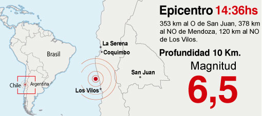 El epicentro se produjo en la localidad chilena Los Vilos, a 350 km dirección Oeste de San Juan y tuvo una profundidad de 10 km. Se percibió intensamente debido a que duró más de 40 segundos.