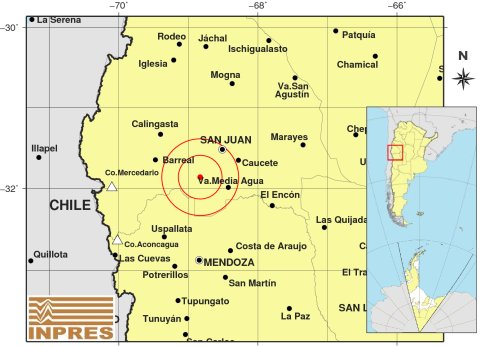 Fue a las 00:29:24, con epicentro 49 km al SO de San Juan; 112 km al N de Mendoza; 41 km al O de Va.Media Agua.