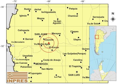 El epicentro fue 62 km al SE de San Juan; 139 km al NE de Mendoza y 35 km al SE de Caucete.