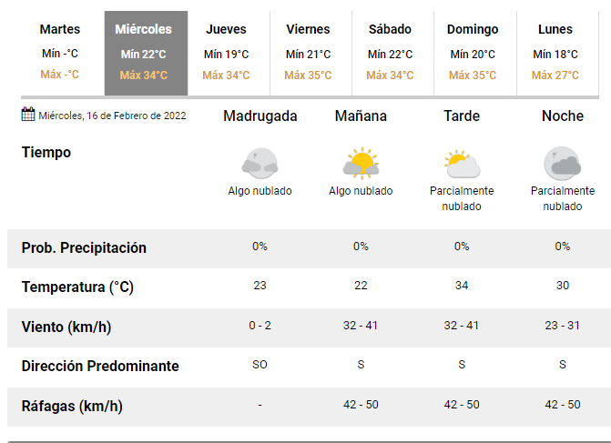 La jornada se presentará con cielo algo nublado y fuertes ráfagas de viento sur, que oscilarán entre los 42 a 50 km/h y que persistirán desde la mañana hasta la noche.