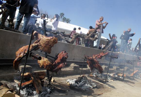 Nunca antes se había realizado una fiesta de este tipo y la gente respondió al convite, por demás pintoresco porque había cuatro variedades de punta de espalda. Así, la fosa circular que tiene un vagón de tren, fue el lugar elegido para asar y cocinar las 500 puntas de espaldas previstas para el primer día (hoy habrá otras 500, para totalizar unas dos toneladas y media de carne durante todo el festival). Allí había ocho parrillas para la variedad de asado a las brasas, mientras que alrededor, más de 40 pinches doraban las puntas de espalda a la llama. En tanto, en el sector medio colocaron tres grandes círculos en los que cocinaron la carne al disco, mezclada con verduras. A su vez, la cuarta variedad, la punta de espalda al horno, la hicieron en el sector posterior de la carpa cocina.