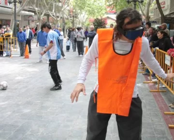 "Arco, arco", gritaba una profesora mientras aplaudía detrás del arquero. "A la derecha, un poco más atrás", decía un profesor ubicado en la orilla de la cancha. "¿Dónde está el arco, profe?", preguntaba perdido el jugador de Marquesado, Roberto Ovejero. Mientras tanto, todos se concentraban en escuchar los cascabeles que sonaban adentro de la pelota en un partido que se jugó de oído. Fue ayer, en el Día Internacional del Bastón Blanco, cuando un grupo de jugadores profesionales de fútbol se cubrió los ojos para disputar un partido contra personas ciegas, en la peatonal Tucumán.