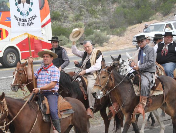 Gioja este año acortó la distancia que solía recorrer habitualmente y por eso esperó al gauchaje en el paraje Caputo, a unos 4 kilómetros de la Difunta Correa. Llegó exultante y de buen humor. Allí lo esperaba Walter Lima, secretario General de la Gobernación, quien tenía a Peregrino ensillado y listo para ser montado.