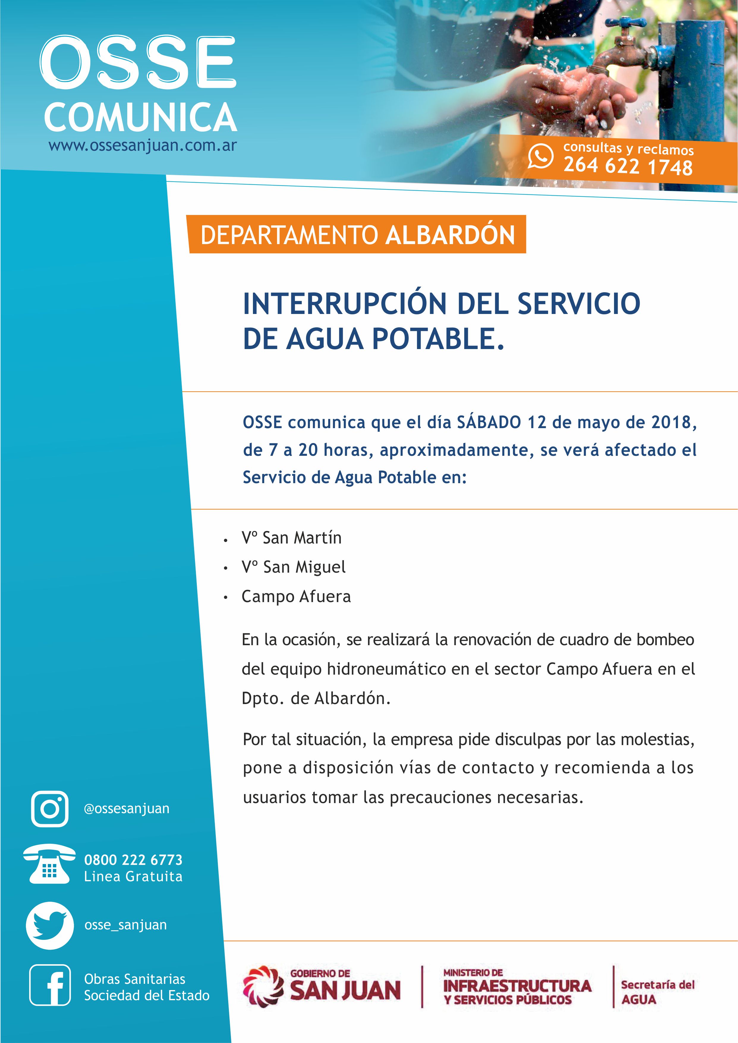 Gran parte de Albardón no tendrá agua potable durante todo el día