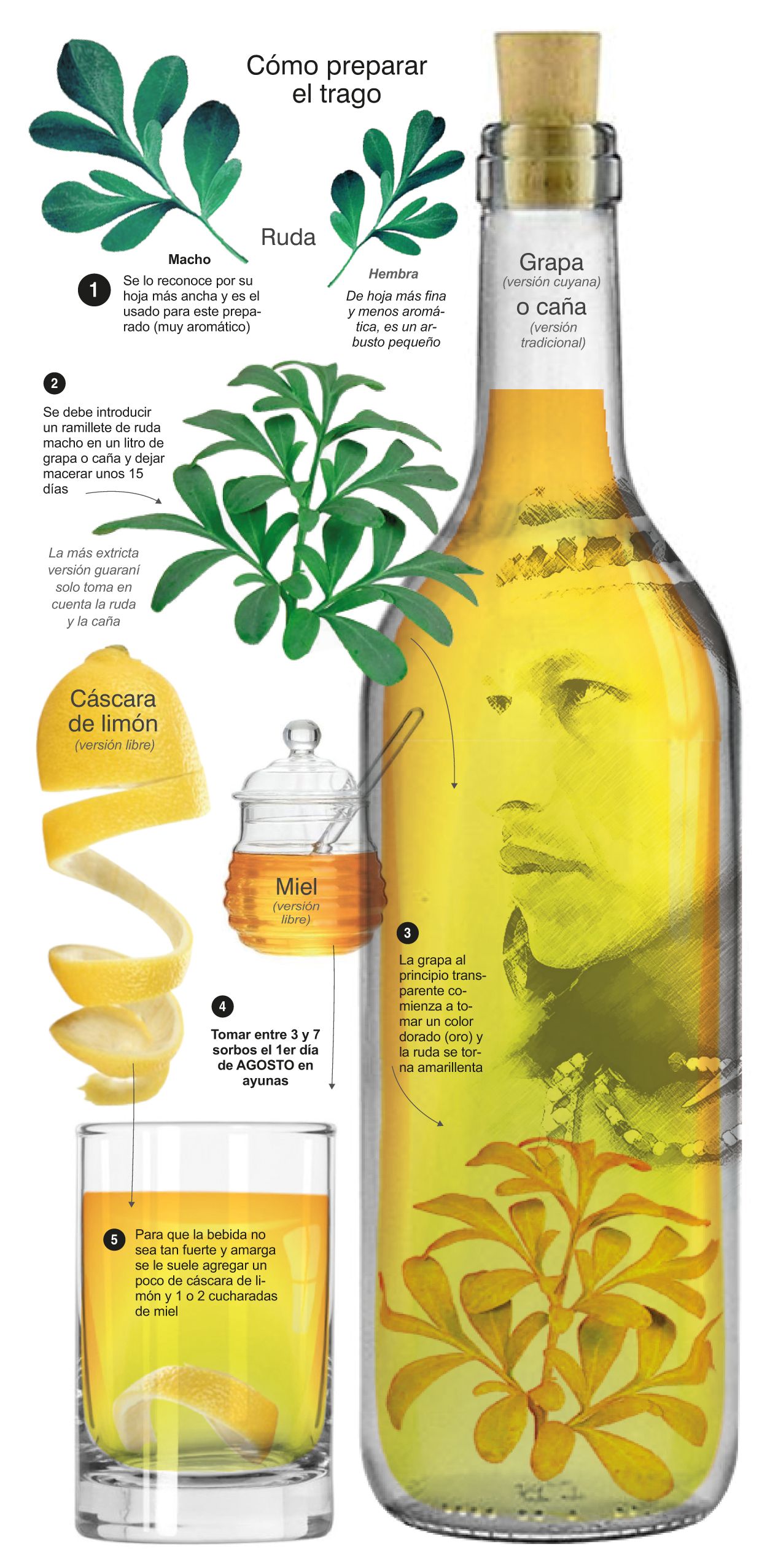 Tomar caña o grapa con ruda en ayunas el 1 de agosto es un ritual ancestral que nació para alejar los maleficios y atraer salud y suerte. La tradición más enraizada asegura que de esta manera se espantan los males del invierno. La creencia se fundamenta en que en el mes de agosto se producían muchas muertes en la población y el ganado, como consecuencia del crudo frío de julio. De ahí el famoso dicho ‘julio los prepara y agosto se los lleva‘. Para poder sortear esos infortunios, los pueblos originarios de América del Sur crearon un remedio natural: la caña con ruda macho. Con la llegada tardía (1944) del brebaje a la zona de Cuyo, se cambió la caña por grapa. Bebida tan noble como la caña, pero más barata y fácil de fabricar con orujos de uva. El cambio en uno de los ingredientes principales hace que las provincias de Cuyo tengan su propia versión de la pócima, pero es que también, el valle tiene su propia versión climática de agosto. (Agosto es el mes de los zondas con cambios bruscos de temperaturas.) La grapa con ruda macho debe ser preparada la noche de San Juan Bautista, el 24 de junio (según rezan las tradiciones más puristas del folclore local), sin agregados y macerada debidamente en un lugar oscuro y fresco hasta el 1 de agosto (día de la Pachamama). Hay versiones, entre las más benévolas, que indican que debe llevar cáscara de limón y miel y menos de 15 días de maceración. Las más extremas indican enterrar la botella en un pozo durante 1 año. Al extraerla, debe realizarse un baile en agradecimiento a la Pachamama volcando parte del preparado en la tierra. Al levantarse y en ayunas, se toma tragos de grapa con ruda (generalmente tres o siete) para atraer la salud, la suerte y alejar los maleficios en un brindis venerando a la Pachamama. En cualquier caso, los efectos colaterales siguen siendo los mismos.