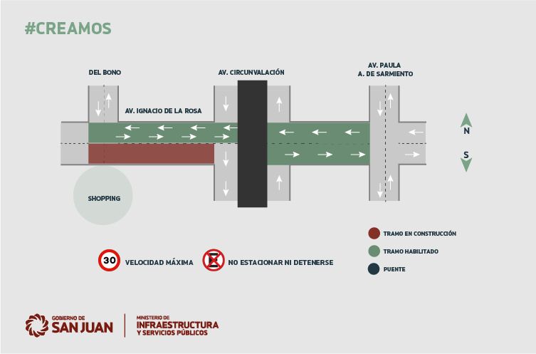 El primer tramo habilitado al tránsito es el que comprende Ignacio de la Roza entre avenida Paula Albarracín de Sarmiento y calle Del Bono. La circulación prevista, que debe realizarse con precaución por tratarse de una obra con aspectos aún en etapa de ejecución, es en doble sentido asegurando la transitabilidad este-oeste de modo continuo, tal como lo indica el siguiente gráfico.