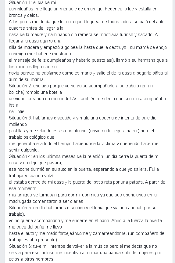 También escribió sobre hechos puntuales que vivió y hasta enumeró las situación: "En los últimos meses de la relación, un día cerré la puerta de mi casa y no deje que pasara. Esa noche durmió en su auto en la puerta, esperando a que yo saliera. Fui a trabajar y cuando volví