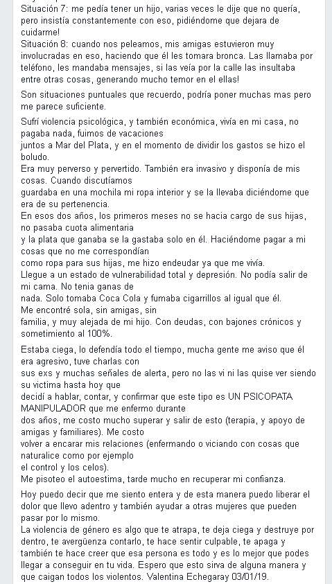 Ahora, Valentina Echegaray fue quien publicó una extensa declaración de cómo era su relación con él. "Ya no tengo miedo a callar el infierno que me hizo vivir", comenzó su relato.
