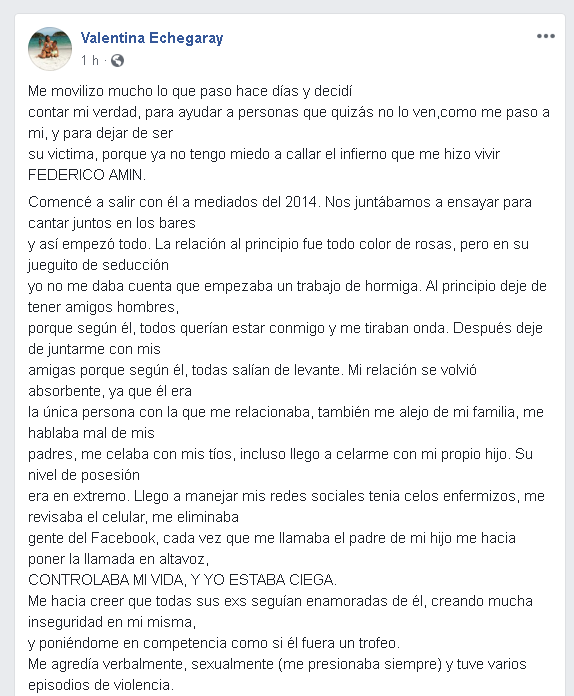 Luego de que en las redes sociales escracharan al cantante de Pijama, Federico Amin, por un supuesto hecho de violencia que ocurrió en una fiesta, en el salón Palmares, la exnovia del músico utilizó Facebook para dar su versión de lo que vivió con él cuando estaban en pareja.