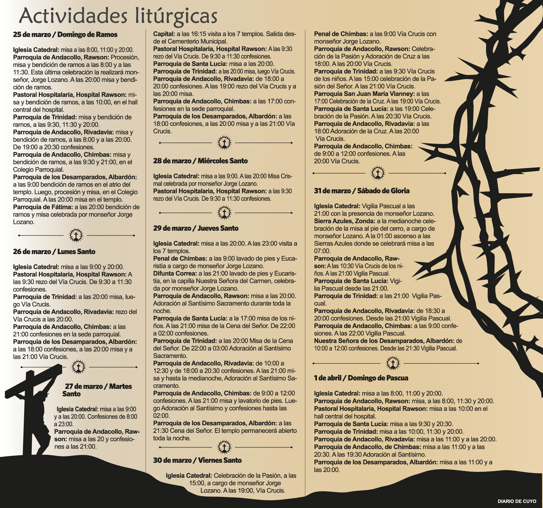 Hoy arranca la Semana Santa y habrá actividades litúrgicas, como Vía Crucis y vigilia, hasta el próximo domingo. A continuación, una guía con la programación de algunas parroquias principales y con la agenda de monseñor, Jorge Lozano. El Jueves Santo, el Obispo realizará la ceremonia del lavado de pies y celebrará la Eucaristía en el Penal de Chimbas, en la mañana. Por la tarde realizará ambas actividades en la capilla que está en el predio del santuario de la Difunta Correa.