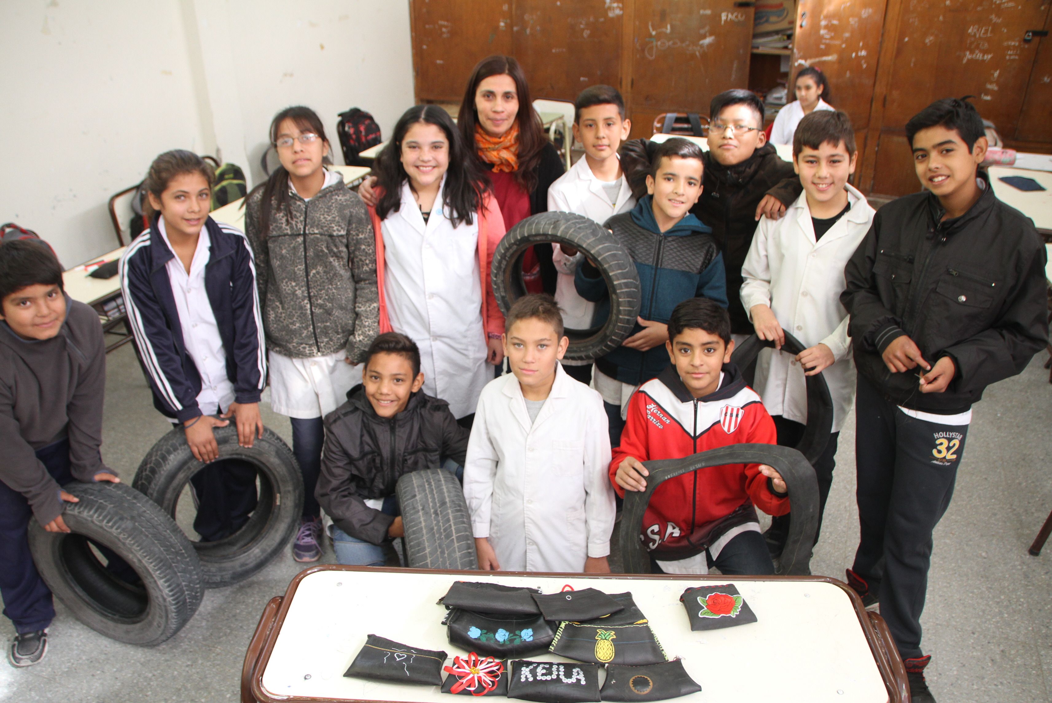 Son movedizos y siempre tienen ideas nuevas. Así, los alumnos de sexto grado de la escuela que está en Rivadavia, buscan aprender distintas técnicas manuales, pero a la vez quieren que lo que producen sirva para ayudar a otros. Cuando comenzó el año, la docente Claudia Rementería, propuso el proyecto y el curso entero se prendió. Fuera de hora de clases recorren gomerías de la zona y hasta acuden a familiares para conseguir las cámaras que van adentro de las ruedas de auto, de bicicletas y de motos. Una vez que obtienen el material, lo llevan a la escuela para poder manipularlo. Es por eso que, cada miércoles, durante un par de horas, cambian los libros por las herramientas y el aula se llena de ruedas.