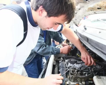 ‘¿A qué hora pasamos a la parte práctica?‘, se escuchó en el salón de actos de la escuela. Al cabo de casi una hora de conferencia, dos alumnos tomaron los envases de combustible y, con el líquido en estado puro, salieron hacia el taller de Automotores.