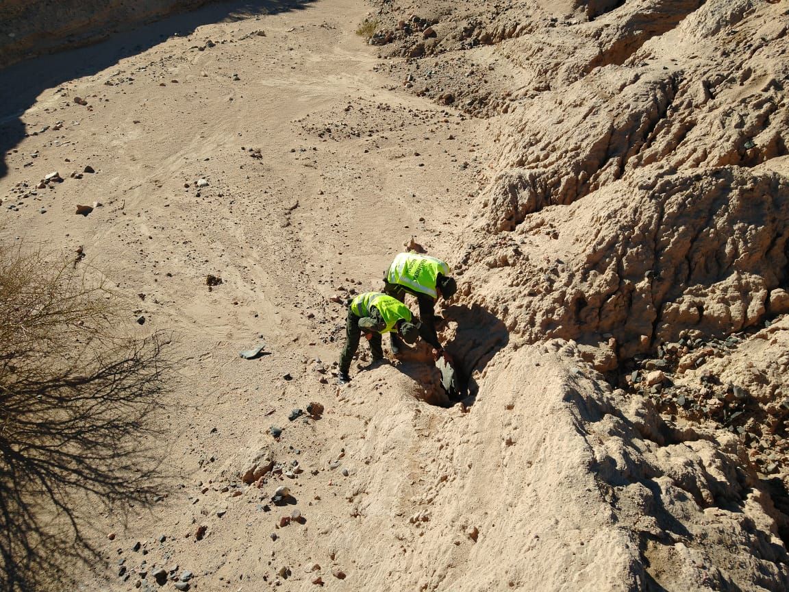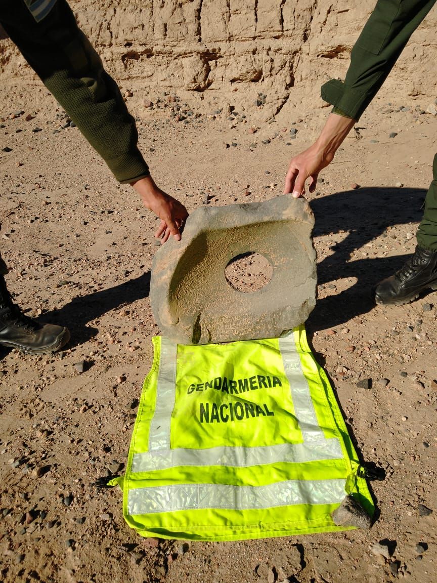 Durante un recorrido en la zona conocida como Tamberías Indígenas, en Angualasto (Iglesia), personal de Gendarmería encontró una conana, una piedra con un orificio en el centro antigua que es considerada patrimonio cultural.