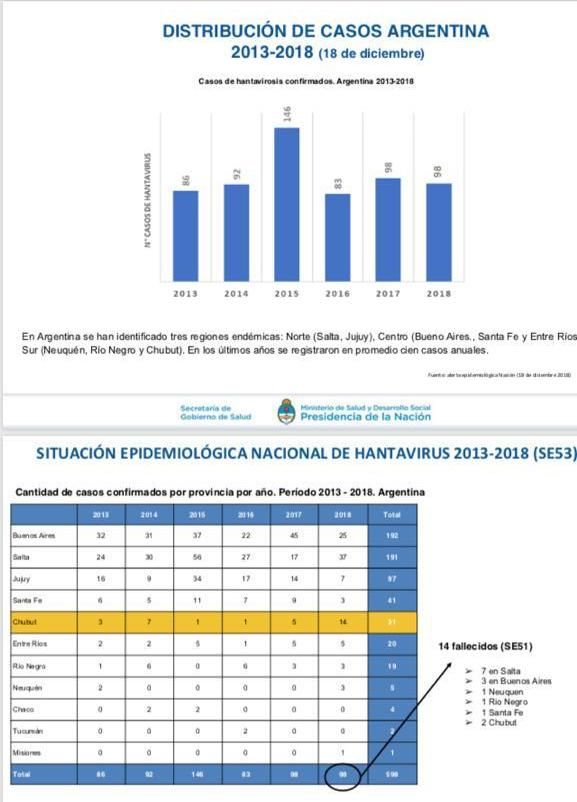 Y detalló que “de hecho, por año, en el país se registran alrededor de 100 casos de hantavirus. Sumado a eso, el tipo de virus con el que se contagiaron las personas en el Sur del país, no es el mismo que el que tienen las personas contagiadas en el resto de las provincias, es decir, que estos no tienen relación con el brote”.