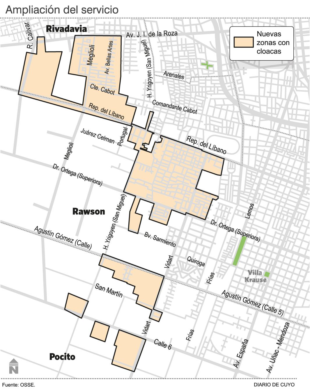 Según se dio a conocer desde OSSE, algunos de los barrios beneficiarios serán, entre otros, el Lote Hogar Nº 27, El Cordillerano, FOECYT, Los Ceibos, UDA, Cerro Grande, Barrio Luz y Fuerza, UPCN, en Pocito. En el caso de Rawson, los complejos incluidos son el SUTIAGYF, SOEVA, Pablo Rojas, Las Garzas, M. Güemes, Hualilán Sur, Hualilán I y II, UDAP, ampliación 23 de Mayo, Villa Angélica, Villa Arce, Lote Hogar Nº 22, Cruz del Sur, 12 de Diciembre, Viñedos del Sur y 23 de Mayo. Mientras que en Rivadavia se encuentran los barrios Olivares de Natania, Piuquén, CESAP y Caja Médicos y Odontólogos, entre otros.
