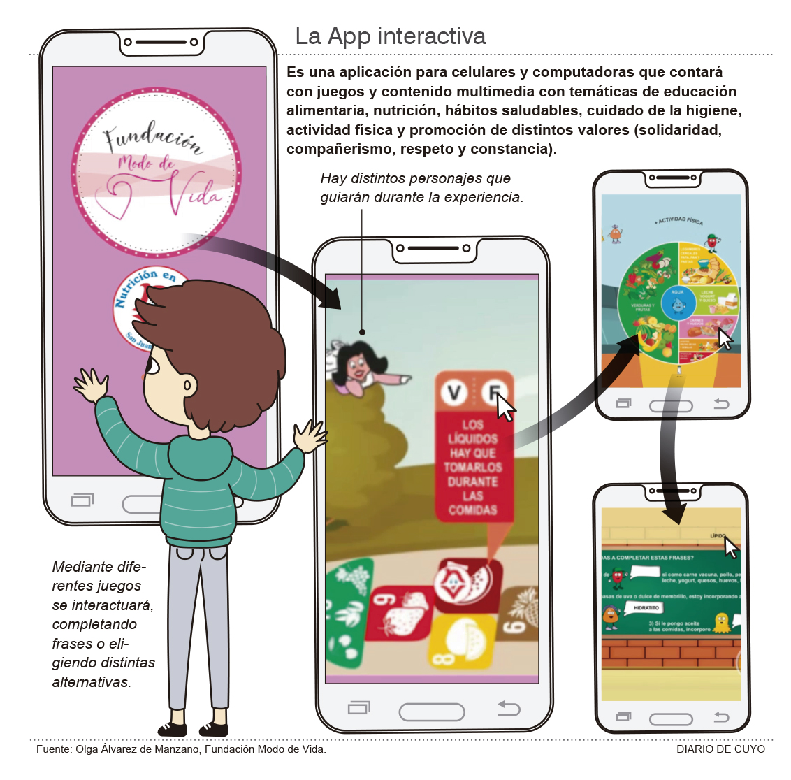 Esta app contendrá juegos interactivos para que chicos participen, todos con contenidos educativos sobre buena alimentación y buenos hábitos. Algunos serán de preguntas y respuestas, de completar frases y de actividades como el tejo de las frutas. Y contarán con la guía de los protagonistas de Nutrición en Vivo: los nutrientes. ‘Si bien la app está pensada para los alumnos de Nivel Inicial y primaria, va a estar disponible también en la plataforma de Nutrición en Vivo para que todos puedan acceder a la misma. Para las mamás va a ser una herramienta de gran ayuda para hacer que sus hijos coman sano’, dijo Álvarez de Manzano.