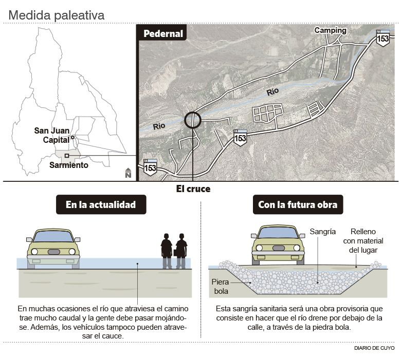 “Haremos una obra sencilla. Vamos a hacer un drenaje del agua por debajo del camino. En los costados ya pusimos caños para drenar el río y para que la gente pueda transitar sin mayores problemas. Ahora vamos a hacer una sangría y vamos a sacar el agua del medio de la calle del pueblo”, dijo el funcionario. Según explicó Martín, la obra consiste en hacer una zanja en parte del río (ver infografía) y la calle para conducir el agua por ahí. En esa zanja, posteriormente, se colocará piedra bola. Una vez hecho esto, se tapará el hueco con tierra para unir nuevamente la calle. “Por esas piedras pasará el agua por debajo, sin llegar a la superficie” agregó el intendente y dijo que se trata de una obra que no generará gastos, pues usarán máquinas de la Municipalidad y piedras que hay en la zona.