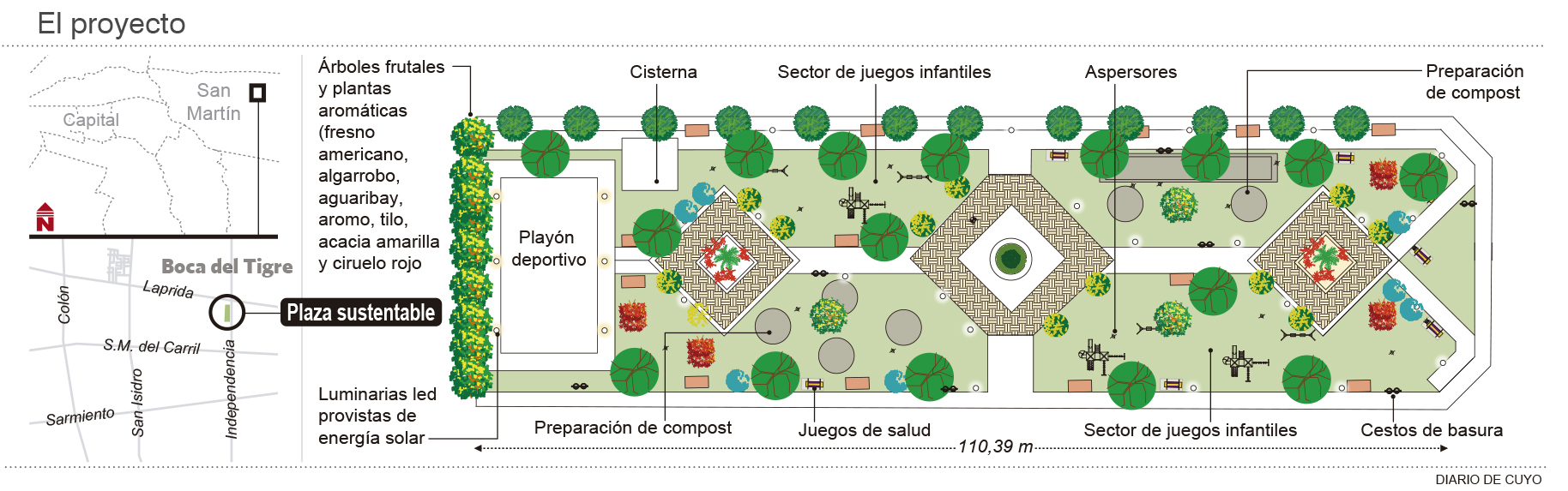 Ofrecer a los vecinos un espacio para recreación es uno de los objetivos que llevó a que la Municipalidad de San Martín comenzara a trabajar en un proyecto para construir una plaza en Boca de Tigre, una zona alejada del departamento, que no tiene ningún otro espacio verde público. Mientras que enseñar a los niños y adultos la importancia del cuidado ambiental fue otro de los motores de este proyecto. Es por esto que el mes que viene comienza la construcción de la primera plaza de esta localidad que será sustentable y que hasta tendrá un sector para que los vecinos puedan producir compost. El intendente Cristian Andino comentó que esta plaza costará $15 millones y que será financiada con fondos nacionales. "Además, vamos a hacerla con las cooperativas del departamento. Es decir, que también vamos a generar puestos de trabajo para nuestra gente", dijo el intendente.