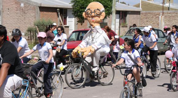 Ayer las calles de distintos barrios de La Puntilla, San Martín, estuvieron copadas por 450 chicos que pedalearon, junto al Papa Francisco, en honor a San Juan Bosco. Es que la imagen gigante del Sumo Pontífice, realizada en gomaespuma, fue portada por uno de los alumnos de la escuela de Capacitación Laboral San Juan Bosco. Los ciclistas fueron divididos según los niveles escolares, por lo tanto partieron desde 4 puntos distintos, acoplándose en cada posta. Esta bicicleteada se realizó en el marco de la novena del santo que culminará el próximo domingo.