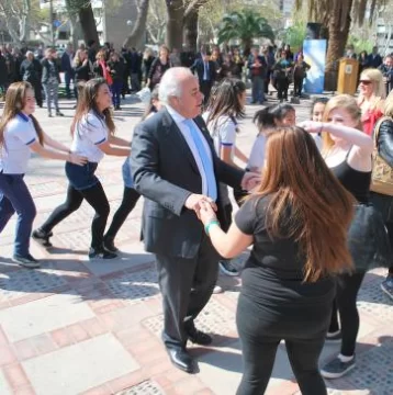 La VII Fiesta de la Educación se cerró como tal: una fiesta, con baile incluido en plena plaza. El final de la Gala Gimnástica, que por segundo año consecutivo se realizó con las escuelas participantes, de pronto encontró a las alumnas cordobesas del Instituto Provincial de Educación Agropecuaria y Técnica Juan Garro abandonando su coreografía e invitando a bailar a otros estudiantes. Y ahí nomás tomaron de la mano a algunos funcionarios incluido el intendente de la Capital, Marcelo Lima, quien aceptó el convite. Entonces, en la plaza Aberastain, todos terminaron bailando y hasta haciendo trencitos.