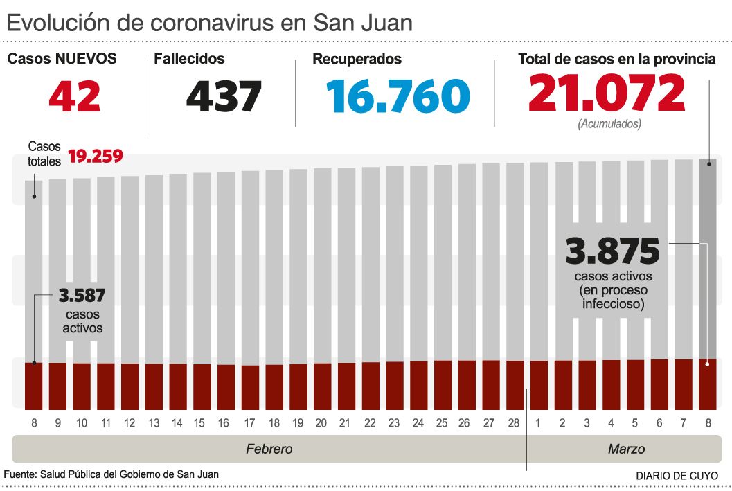 Los números diarios de confirmaciones Covid en San Juan siguen a la baja y en lo que va del mes promedia 40 diarias. Son similares al periodo previo al pico de octubre-noviembre y en el balance intermensual, la provincia acumula los últimos tres meses con disminución de contagios en forma consecutiva. Mónica Jofré, responsable de Epidemiología de Salud Pública, cree que la explicación radica en un conjunto de factores, que van de la toma de conciencia y el respeto a la medidas de prevención hasta la decisión de priorizar el turismo interno y evitar ciudades con otras situaciones sanitarias y mayor exposición.