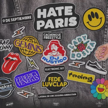 Hate paris el regreso, propone un trip que pasara por el freestyle, reggaeton, cumbia coqueta, rock, trap, RKT, oldies, bizarros y mucho mas en su pista general donde, en sinergia única y sin orden de jerarquías lo darán todo por la música #GEMINIS – EL TEMPLO DEL POP – #LADYROSITA, la nueva superheroína y Sebastián Chavarri AKA RUSTICO – MZA- que prometen llevarnos de viaje por un set impecable, lustrado, preciso y cromado, acompañado de una diversa lista de intervenciones artísticas, para dejar los ojos paralizados, alta puesta en escena.