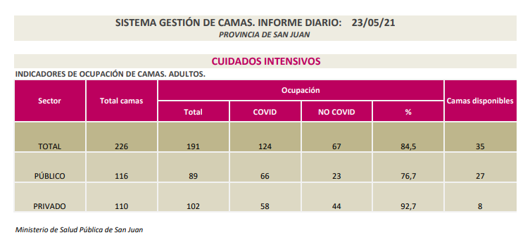 También detallaron la situación que presenta el área de terapia intensiva. De una ocupación de camas del 81,4% entre el sector público y estatal pasó este domingo a 84,5%.