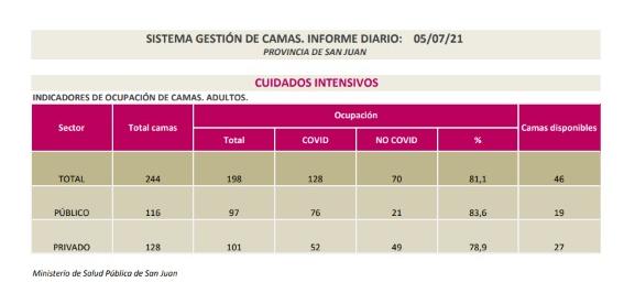 Además, se encuentran internados 251 pacientes en las áreas de COVID-19 (entre positivos y sospechosos) de los hospitales Dr. Guillermo Rawson; Dr. Marcial Quiroga; Dr. Ventura Lloveras, de Sarmiento; Dr. César Aguilar, de Caucete; Dr. José Giordano, de Albardón; Dr. Federico Cantoni, de Pocito; CEMEC; Dra. Julieta Lanteri; Hospital San Roque, de Jáchal; Hospital Dr. Alejandro Albarracín, de Valle Fértil; Hospital de Barreal, de Calingasta; Hospital Privado; Instituto Médico; Clínica El Castaño; Clínica Santa Clara; Sanatorio San Juan y CCI.