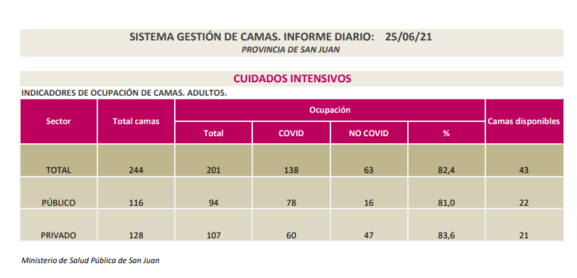 Además, se encuentran internados 256 pacientes en las áreas de COVID-19 (entre positivos y sospechosos) de los hospitales Dr. Guillermo Rawson; Dr. Marcial Quiroga; Dr. Ventura Lloveras, de Sarmiento; Dr. César Aguilar, de Caucete; Dr. José Giordano, de Albardón; Dr. Federico Cantoni, de Pocito; CEMEC; Dra. Julieta Lanteri; Hospital San Roque, de Jáchal; Hospital Dr. Alejandro Albarracín, de Valle Fértil; Hospital de Barreal, de Calingasta; Hospital Privado; Instituto Médico; Clínica El Castaño; Clínica Santa Clara; Sanatorio San Juan y CCI.