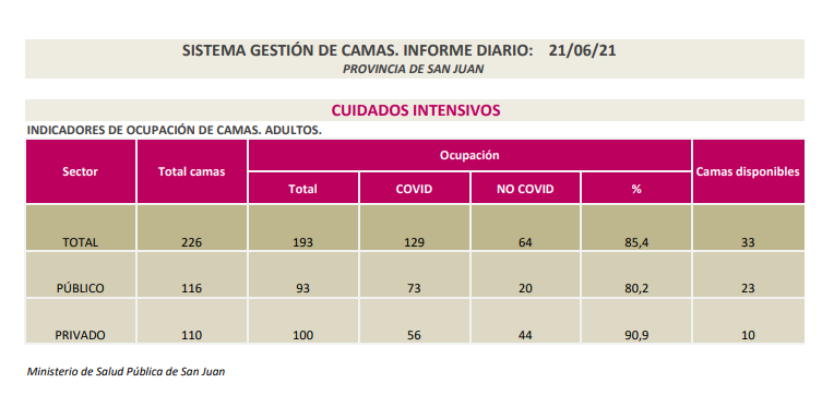 En San Juan, el 85,4% de camas en cuidados intensivos está ocupado según lo que informa el Ministerio de Salud Pública. Del mismo modo, detallaron que hay 33 camas disponibles entre el sector estatal y privado.
