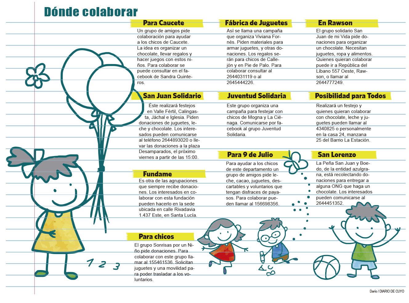 En la previa del Día del Niño, que se celebra el próximo 20 de agosto, muchas ONG, fundaciones, grupos de amigos y de Facebook comenzaron con las clásicas campañas para recaudar donaciones. Hasta el momento hay al menos 10 grupos que están pidiendo juguetes, chocolates, galletas, golosinas y otras donaciones que serán entregadas a chicos de diferentes departamentos.