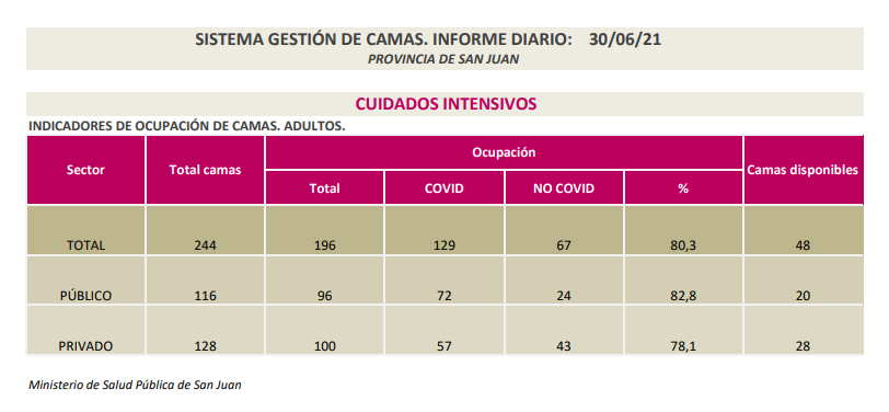 Además, se encuentran internados 244 pacientes en las áreas de COVID-19 (entre positivos y sospechosos) de los hospitales Dr. Guillermo Rawson; Dr. Marcial Quiroga; Dr. Ventura Lloveras, de Sarmiento; Dr. César Aguilar, de Caucete; Dr. José Giordano, de Albardón; Dr. Federico Cantoni, de Pocito; CEMEC; Dra. Julieta Lanteri; Hospital San Roque, de Jáchal; Hospital Dr. Alejandro Albarracín, de Valle Fértil; Hospital de Barreal, de Calingasta; Hospital Privado; Instituto Médico; Clínica El Castaño; Clínica Santa Clara; Sanatorio San Juan y CCI.