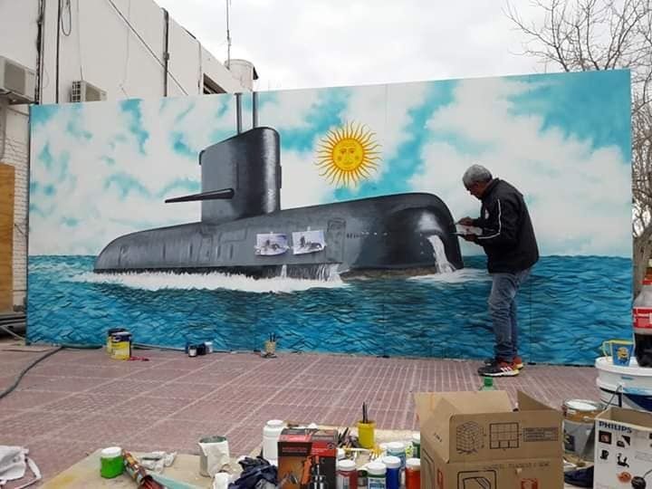 La zona peatonal de la villa cabecera de Angaco aún no se inaugura, pero cada día revela un nuevo atractivo. El último, y que ya se puede apreciar desde lejos, es un mural gigante que rinde homenaje a los 44 tripulantes del ARA San Juan. Su autor es un artista sanjuanino quien realizó esta obra por encargo de las autoridades municipales. José Castro, intendente de Angaco, dijo que esta pintura tendrá también un fin educativo para los niños del departamento.