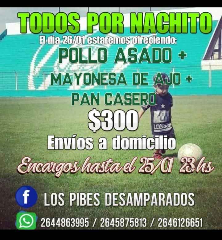 La venta de pollos se realizará este sábado 26 en el estadio de Sportivo Desamparados, que prestó las instalaciones. Hay tiempo de encargarlos hasta las 23 del viernes 25. El valor es de $300 e incluye un pollo, mayonesa de ajo y pan casero. Los envíos son a domicilio y el número de contacto es: 2645875813.