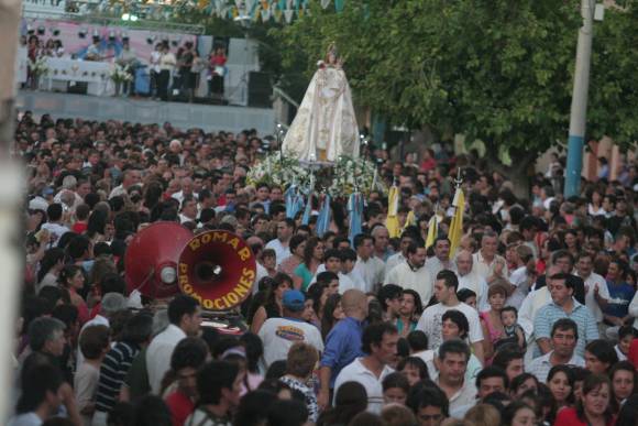 Ni bien terminó la misa, comenzó la procesión, encabezada por la imagen más pequeña de la Virgen de Andacollo. La seguían los danzantes, unos 300 niños y jóvenes identificados con trajes verdes, celestes, rosados, bordó y rojos, y con banderas papales, argentinas y chilenas (la advocación de Andacollo es trasandina). Marchaban al son de tambores y redoblantes, con pasos similares a los de las comparsas de carnaval, para honrar así a la Virgen.