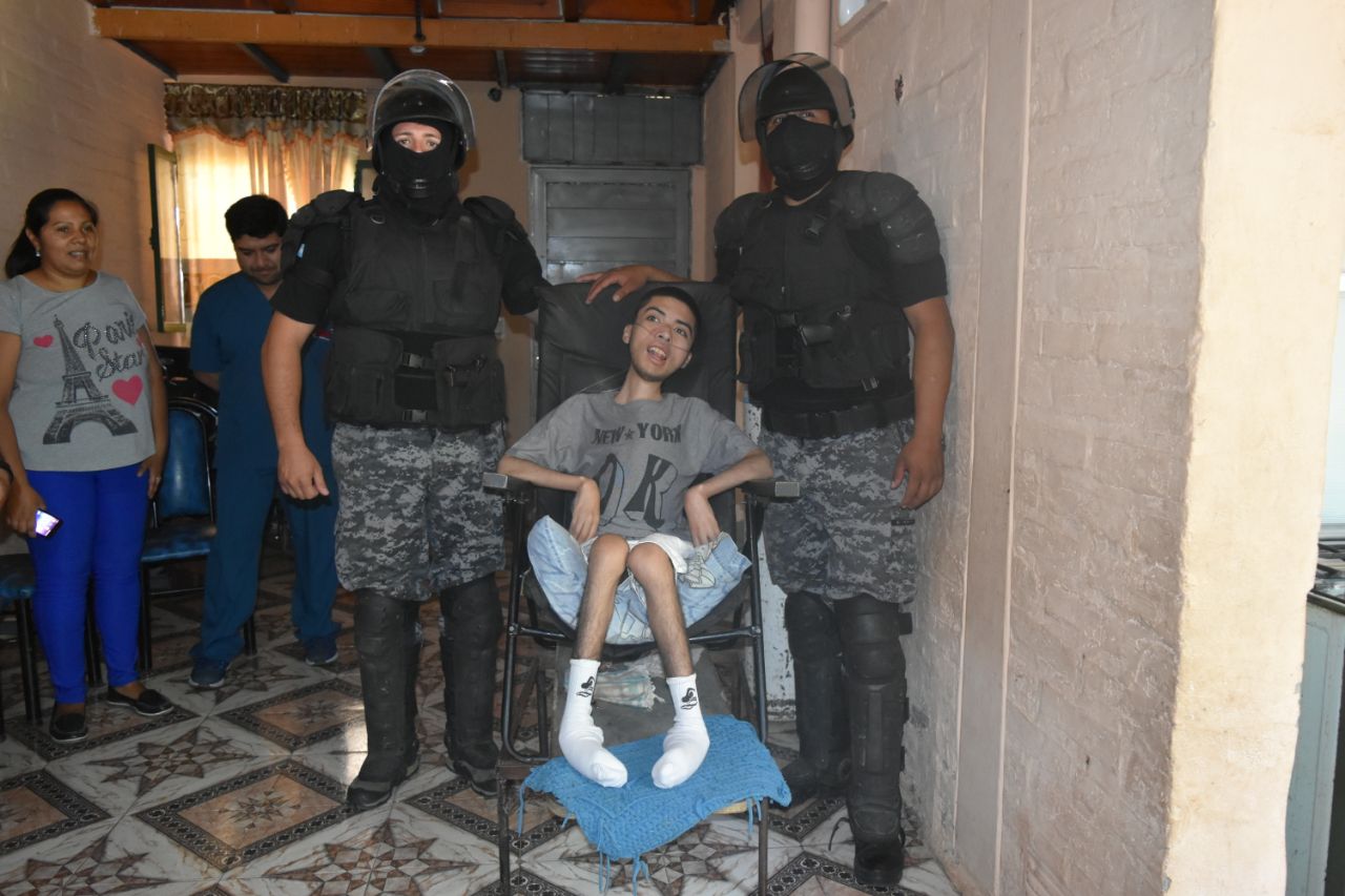 La plana mayor de la Policía le entregó unos obsequios, entre ellos una gorra de la Fuerza, que sacó una sonrisa en el joven. Hasta efectivos del cuerpo especial del GERAS estuvieron en la casa de Horacio. La familia comentó que desde niño quería ser policía, pero la enfermedad -le atrofia los músculos- le truncó el sueño.