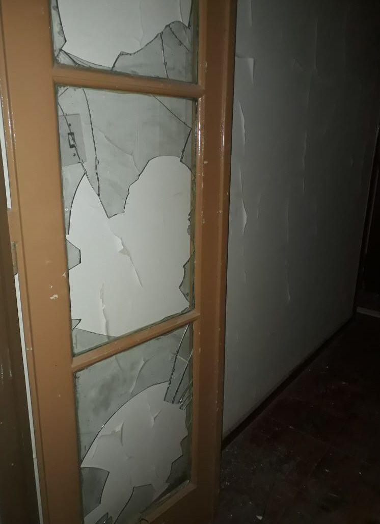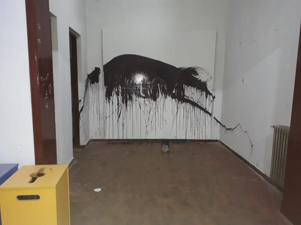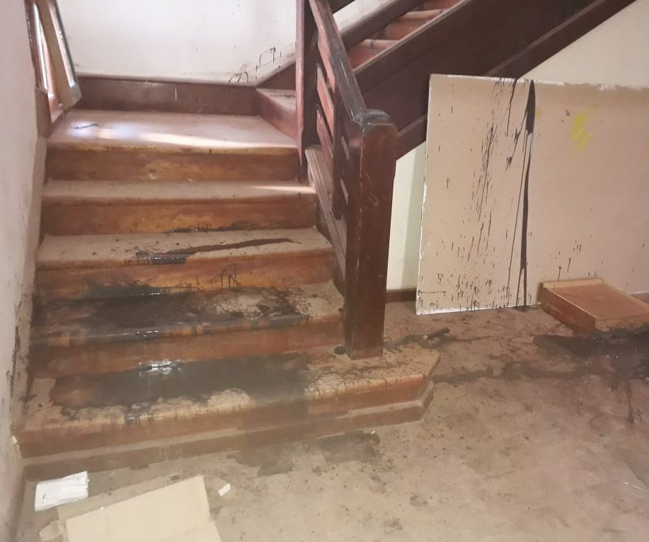 Nuevamente víctima del vandalismo, el edificio estaba manchado con pintura negra en sus paredes y piso, de madera, además de todos los vidrios rotos.