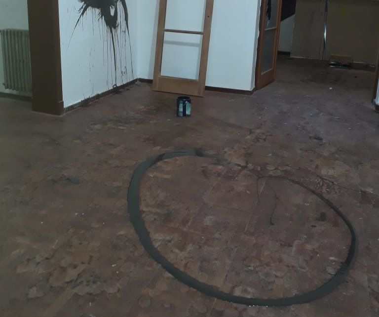 Daño. Las paredes y el piso de sectores ya reacondicionados manchados con pintura y vidrios rotos, el último daño.