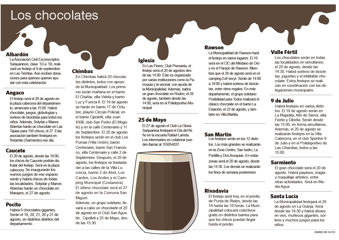 A casi dos semanas de que se conmemore el Día del Niño, las asociaciones civiles ONG, fundaciones y los Municipios ya tienen armado el cronograma de los festejos. Rivadavia será el primer departamento en tener su chocolate para los niños de distintos barrios.