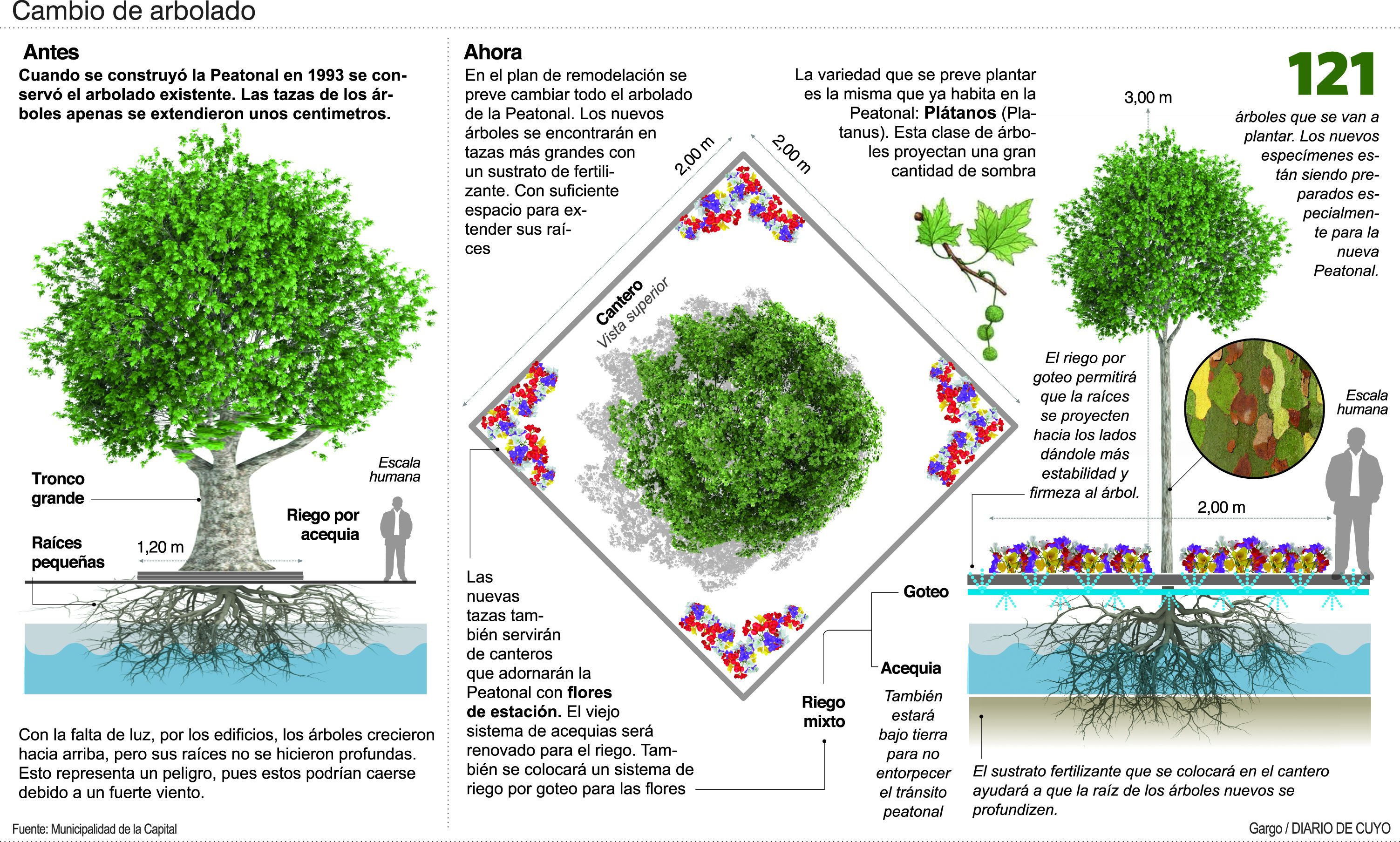 El director de Ambiente de la Municipalidad, Maximiliano Suárez, aseguró que cuando se inició el proyecto de reformar la Peatonal, si bien la idea era mantener el arbolado público, se iba a observar en qué condiciones se encontraba. "Al remover pavimento, veredas, tazas y acequias, nos encontramos con arboles deteriorados. Han crecido confinados en la taza, no tienen un buen desarrollo radicular, más allá que también estuvieron en estrés hídrico", señaló el funcionario. Ante ese panorama, Suárez aseguró que consultaron a "referentes del tema, que son miembros del Consejo del Arbolado" y luego se tomó la medida. "Estamos priorizando el tema de la seguridad. Al descubrir las veredas, pavimento y todo ese sustento, cuando concluyan las obras, puede volcarse algún árbol. Los actuales tienen poco anclaje porque cuentan con escasas raíces, poco desarrolladas y superficiales", añadió el director.