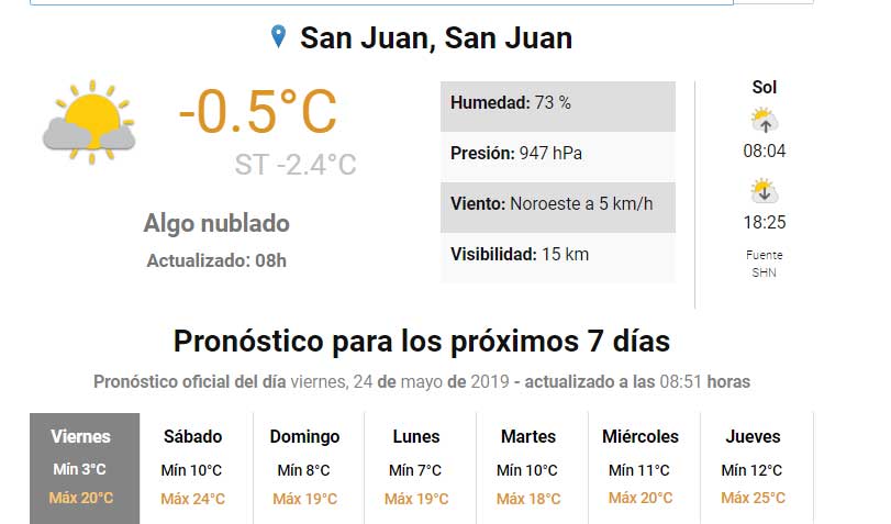 La sensación térmica fue de 2.4 grados bajo cero, con cielo algo nublado y una leve brisa del sector Noreste y obligó a los sanjuaninos a sacar más abrigo del previsto
