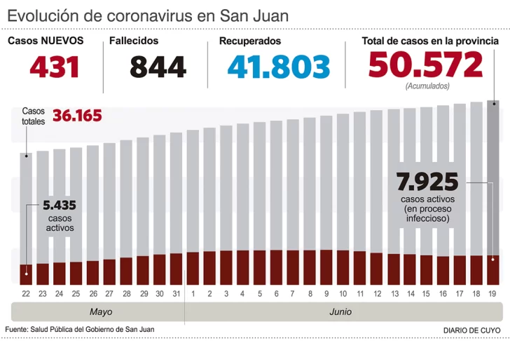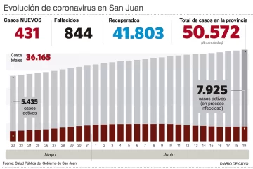 El ministerio de Salud Pública informó ayer la muerte de dos personas a causa de covid y a la vez la detección de 431 nuevos casos. Los fallecidos son un hombre de 87 años, de Santa Lucía; y una mujer de 86 años, de Angaco, y ambos estaban internados en el hospital José Giordano. De esta manera, la cantidad decesos en pandemia se eleva a 844.