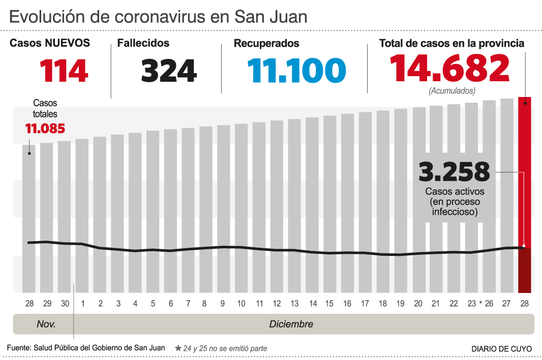 Entre los fallecidos ayer por Covid nuevamente aparecen víctimas jóvenes. Salud Publica informó cinco decesos y entre ellos una mujer de 46 años, oriunda de Jáchal, quien permanecía internada en el hospital Rawson. También murieron dos hombres de 56 y 69 años y dos mujeres de 79 y 88. De esta manera, los fallecidos con coronavirus ahora son 324.