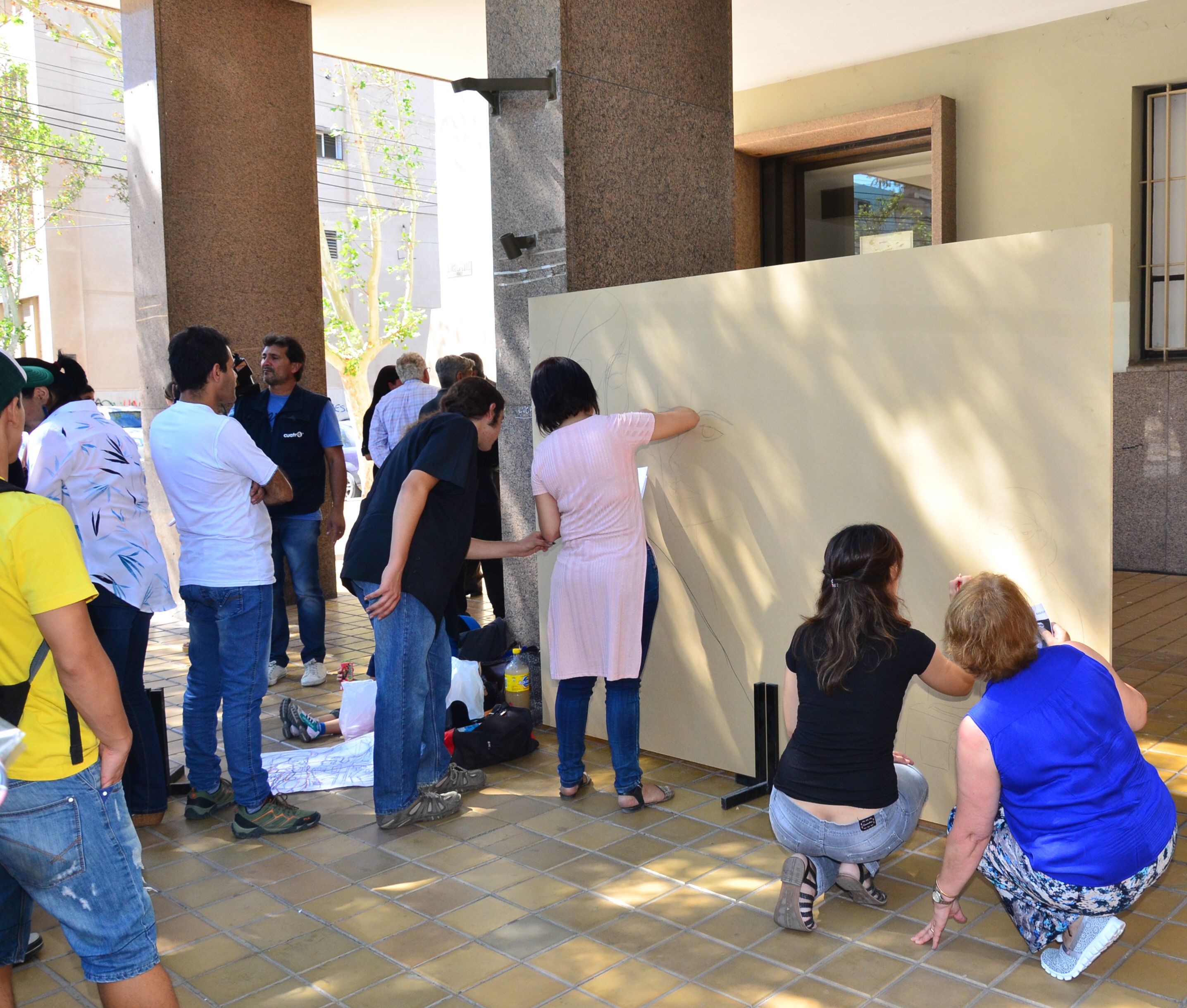 Con arte. En el acto por los derechos de la mujer que se hizo en el Rectorado hubo música y pintada de murales.