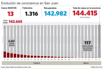 Según informaron, los 13 contagiados fueron confirmados luego de haber procesado 522 test en toda la provincia. De esta manera, a lo largo de la pandemia hay un acumulado de 144.415 infectados de coronavirus.