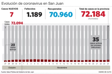 El Ministerio de Salud Pública informó que ayer no hubo decesos y que fueron detectados siete nuevos casos de covid y si bien la cifra es notablemente más baja con respecto a meses anteriores, sí representa un importante salto comparada con la tendencia actual. Estos siete positivos representan la cantidad de confirmaciones diarias más alta en lo que va del mes, superando incluso los seis contagios que hubo recientemente en Jáchal.
