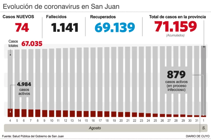Por otro lado, fueron detectados sólo 74 casos positivos, en una jornada en la que hubo 747 test que dieron negativo. Con la curva de contagios en plena desacelaración, el total de infectados en San Juan ahora es de 71.159.