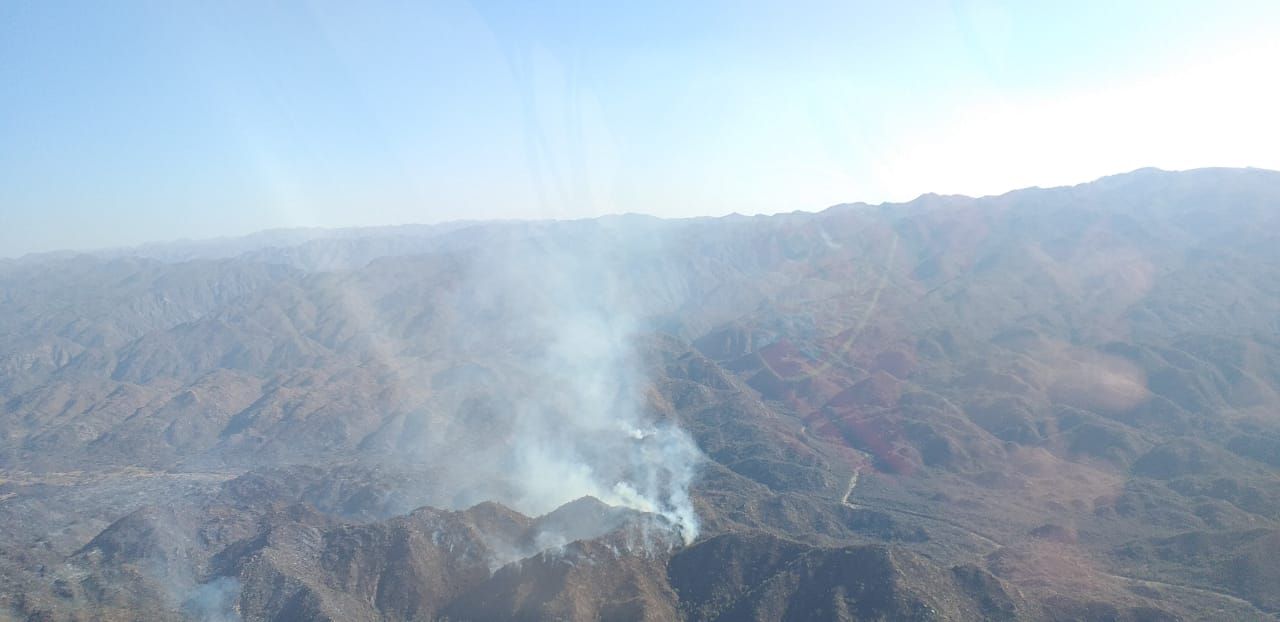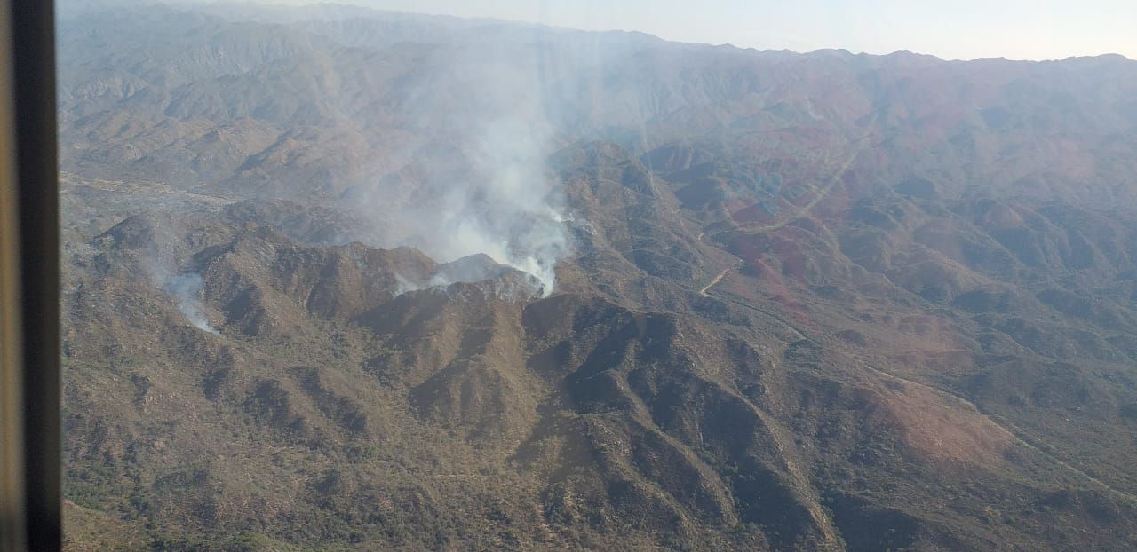 Imagen captada desde el helicóptero, durante la tarde de este jueves en uno de los focos de incendio que se registra en Valle Fértil.