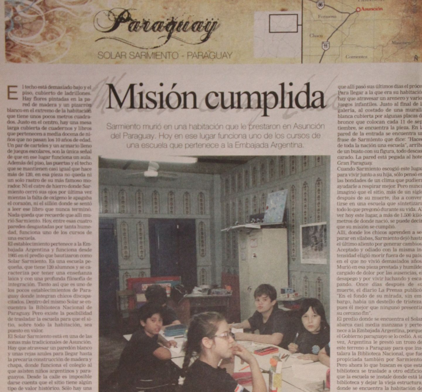 El Solar Sarmiento está en una de las zonas más tradicionales de Asunción. Hay que atravesar un paredón blanco y unas rejas azules para llegar hasta la precaria construcción de madera y chapa, donde funciona el colegio al que asisten niños argentinos y paraguayos. Para llegar a la que era su habitación hay que atravesar un arenero y varios juegos infantiles. En la pared de la entrada se encuentra un frase de Sarmiento que dice: “Haced de toda la nación una escuela”, arriba de un busto con su figura, todo descascarado. La pared está pegada al hotel Gran Paraguay. Desde allí, Sarmiento escribió, leyó, se reunió con amigos, fue atendido por su hija e incluso planificó y empezó a construir una casa “especial”, que nunca pudo concluir porque lo alcanzó la muerte.