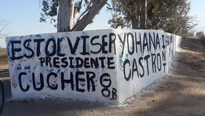 San Juan, 20 de julio.- Parece un chiste, pero no lo es. La pintada está muy mal escrita. Tanto que cuesta entender a qué políticos hace referencia. "Estolviser presidente, Cucher gobernador", puede leerse, haciendo referencia a Margarita Stolbizer y Benjamín Kuchen.